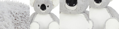 100% polyester. Soft plush grey koala bear. Sewn eyes. Contrast nose. White coloured panel on tummy and feet. Removable inner pad. Zip access for decoration onto front panel. Suitable for embroidery, print and sublimation.