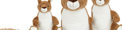 100% polyester. Soft plush mid brown kangaroo. Sewn eyes. Contrast nose. White coloured panel on tummy. Removable inner pad (body only). Zip access for decoration onto front panel. Suitable for embroidery, print and sublimation.