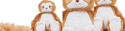100% polyester. Soft plush brown sloth. Contrast face, hands and feet. Sewn eyes and mouth. Tear release fastening on hands. White coloured panel on tummy. Removable inner pad (body only). Zip access for decoration onto front panel. Suitable for embroidery, print and sublimation.