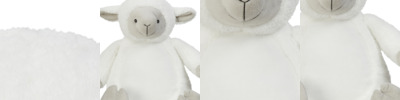 100% polyester. Soft plush cream lamb. Contrast face, hands and feet. Sewn eyes and mouth. White coloured panel on tummy. Removable inner pad. Zip access for decoration onto front panel. Suitable for embroidery, print and sublimation.