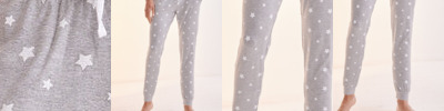 Stretch lounge pants with elasticated waistband and drawcord. Self-fabric cuffed hem with side seam pockets. Tear-out label.