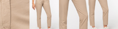98% organic cotton/2% elastane. Stretch twill with peach finish. Enzyme washed. Belt loops. Zip fly with recycled button over. Two side pockets. Rear jetted pockets. Side slits. 7/8 length. Tag free. Due to the washing process each garment is unique.