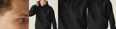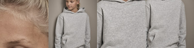 70% organic cotton/30% polyester. Brushed back fleece. Double dyed. Cozy hood. Drop shoulder style. Ribbed collar, cuffs and hem with elastane. Front pouch pocket. Tear out label (in transition to be tag free). 60°C wash.