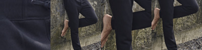 70% ringspun cotton/30% polyester. Three tread fabric for a smooth surface. Brushed back fleece. Double dyed. Ribbed elastane high waistband with drawcord. Two side pockets. Rear pocket. Elastane cuffed leg ends. Twin needle stitching.