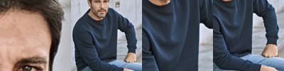 70% ringspun cotton/30% polyester. Three thread fabric for a smooth surface. Brushed back fleece. Double dyed. Drop shoulder style. Ribbed collar, cuffs and hem with elastane. Twin needle stitching. 60°C wash.