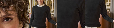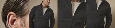 50% merino wool/50% polyacrylic. Tailored fit. Set in sleeves. Fully fashioned. Ribbed collar, cuffs and hem. Machine washable.