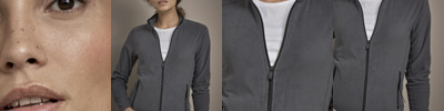 100% polyester. Lightweight performance micro fleece. Anti-pill finish. Shaped fit. Full length zip with laser cut storm flap. Two front zip pockets. Open hem and cuffs.