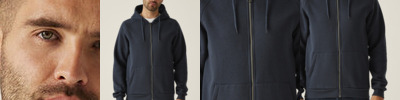 35% sustainable cotton and 65% polyester brushed back fabric. Centre front zip. Ribbed cuffs and hem.
