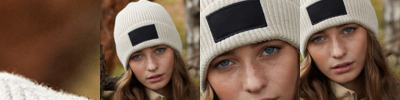52% recycled polyester/47% acrylic/1% elastane. Ribbed knit. Single layer knit. Cuffed design. Cotton twill patch for decoration (6.5 x 3cm). Tear out label.