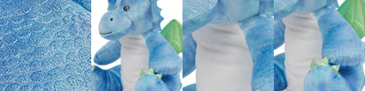 100% polyester. Soft plush blue dragon. Contrast wings and claws. Sewn eyes and mouth. White colour panel on tummy. Removeable inner pad. Zip access for decoration onto front panel. Suitable for embroidery, print and sublimation.