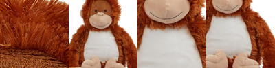 100% polyester. Soft plush orangutan. Contrast face, hands and feet. Sewn eyes and mouth. White colour panel on tummy. Removeable inner pad. Tear release fastening on hands. Zip access for decoration onto front panel. Suitable for embroidery, print and sublimation.