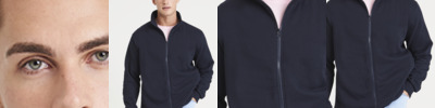 52% ringspun cotton/48% polyester. Soft cotton faced fabric. Brushed back fleece. Drop shoulder style. Full length plastic YKK zip. Ribbed side panels. Ribbed cuffs and hem. Tear out label.