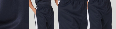 Shorts with elasticated waist and inner drawcords. Contrast side panels. Zipped side seam pockets. Twin-needle stitched hem.
