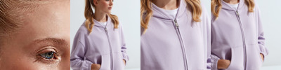 Oversized, cropped, zipped hoodie. Zip to centre. Drawstring tie to waist. Kangaroo pockets to front. Contains recycled polyester fabric. The product contains no branded neck or waist label. Removable kimble or looped garment tags. The inner seam label holds important product information on one label with a second label containing brand information which can be cut-away.