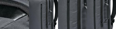 Recycled 600D polyester. PVC and phthalate free.Reinforced grab handles, top and side.Padded adjustable shoulder straps.Padded air mesh back panel.Main zip compartment.Internal organiser section.Secure front zip pocket.Padded laptop compartment compatible up to 17".Wheeled luggage compatible.Capacity 21 litres.
