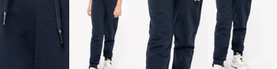 85% organic combed cotton/15% recycled polyester. Brushed back fleece. Enzyme washed. 1x1 ribbed elasticated waistband with buttonhole eyelets and organic cotton drawcord. Two side pockets. Right rear pocket. 1x1 ribbed cuffed leg ends. Tag free. Recycled polyester is made from post-consumer waste.
