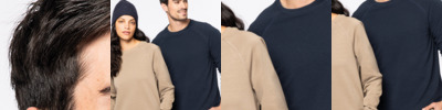 50% organic cotton/50% recycled polyester. Raglan sleeves. Fully fashioned knit. Ribbed collar, cuffs and hem. Navy blue herringbone taped neck. Personalisation patch inside neck. Tag free. Recycled polyester is made from post-consumer waste.