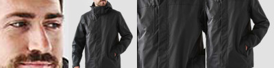 Nylon taslon outer. Polyester lining. Outer jacket is waterproof 8000mm with taped seams and breathable 8000g. Detachable adjustable hood. Full length zip with chin guard and inner zip guard. Outer studded storm flap. Right chest zip pocket. Articulated action elbows. Inner pocket. Two front zip pockets. Tear release adjustable cuffs. Drawcord hem. Reflective detail on centre back and lower sleeves. Removable polyester pongee thermal jacket. High loft synthetic insulation. Full length zip. Two front zip pockets. Elasticated cuffs. Access for decoration on outer jacket.