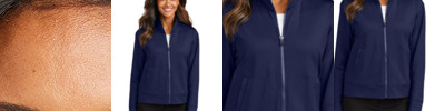 * 100% polyester double-knit * Ladies' fit * Woven label * Front zipper * Set-in sleeves * Front pockets * Dual inside pockets * Striped rib-knit collar, cuffs and bottom band