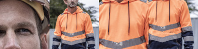 100% polyester. Conforms to EN ISO 20471: 2013 + A1: 2016 class 2. RIS-3279-TOM (orange only). Brushed back fleece. Jersey lined hood with adjustable toggle drawcord. Two angled ID reflective tape bands around the body, sleeves and one on each shoulder. Front pouch pocket. Contrast lower sleeves and body. Ribbed cuffs and hem. Cut out label.