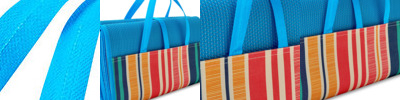 Textured stripe design beach mate, with fabric carrying straps. Mat is made from 100% polypropylene, and is 150cm x 180cm.