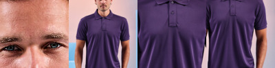Polyester. Contemporary fit. 2 button placket. Short sleeves. Side vents. Knitted collar. Machine washable. Quadcool four channel yarn. Sweat wicking technology.
