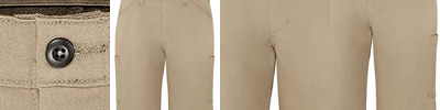 - Two slack-style front pockets, welt back pockets, and dual cargo pockets