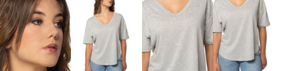 - Features ribbed scoop neck, short rolled sleeves, and a longer back hem for extra coverage